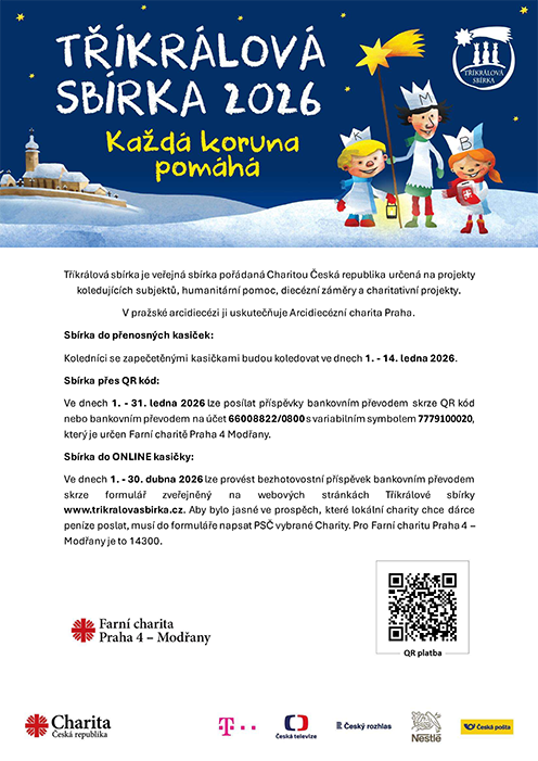 Tříkrálový koncert proběhne 4.1. 2026 od 16:00 v modřanském kostele, sbírka přes QR kód trvá až do 31.1. 2026